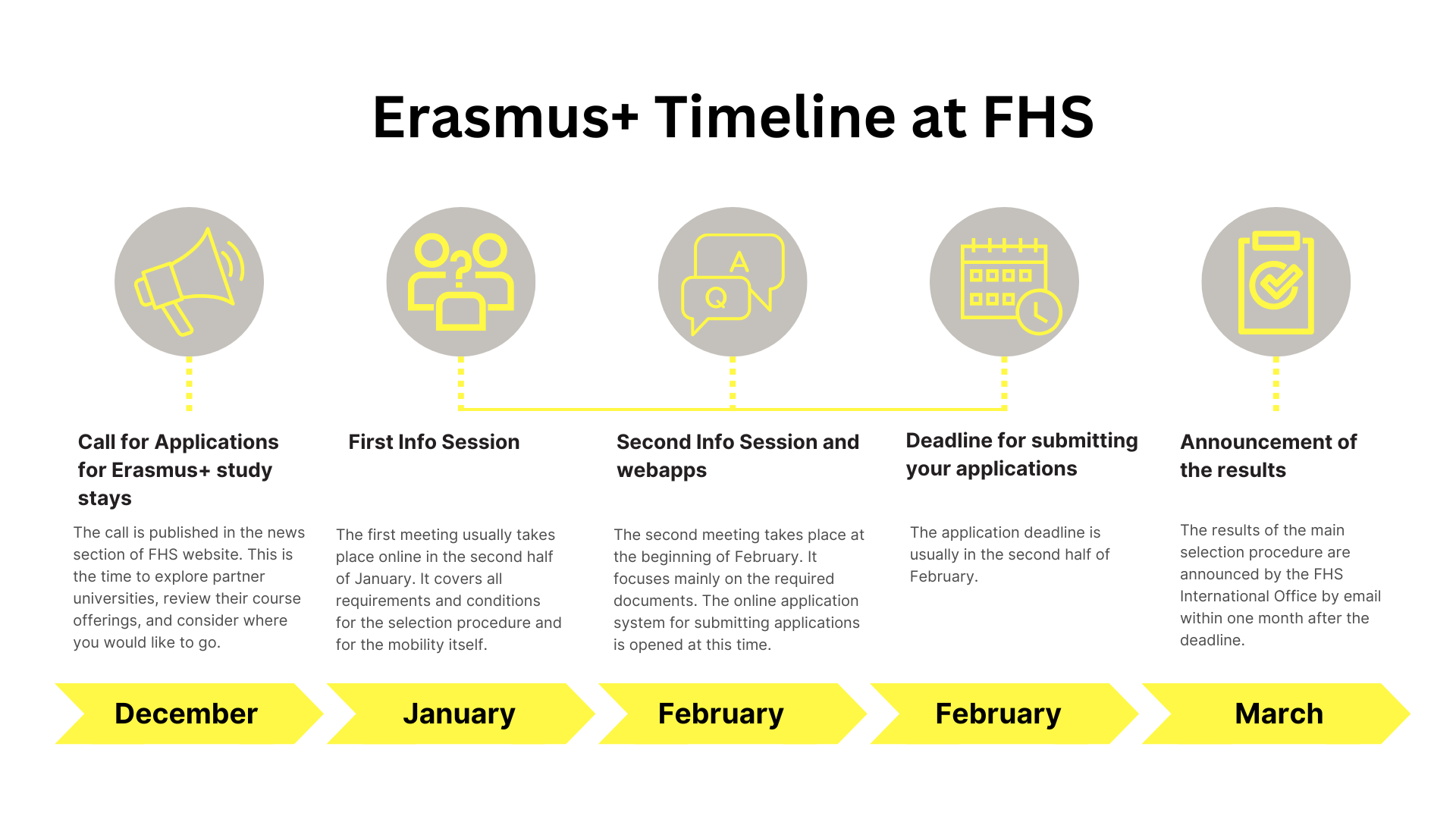 The main selection procedure for Erasmus+ study abroad is held in February. Students can apply for either winter or summer semester of the upcoming academic year.